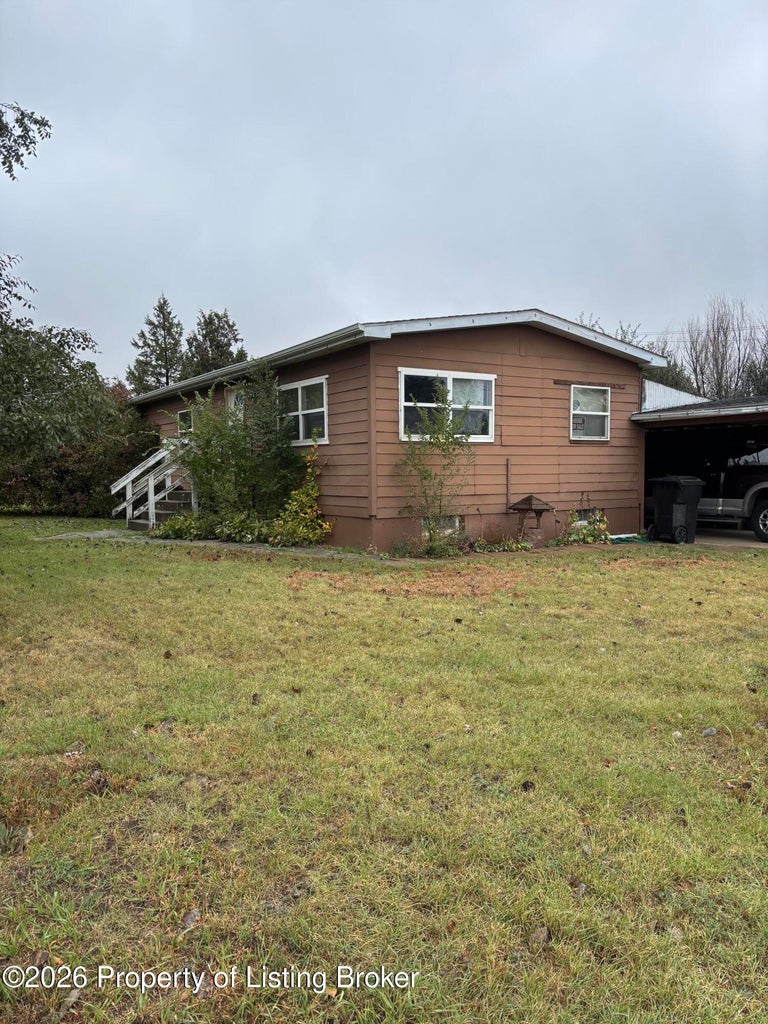 This 4 bed (+den), 2 bath property sits on a corner & spans 3 lots with mature trees, large garage/shop, detached garage & carport-excellent setup for storage, equipment, or future expansion. Located near the hospital, school, & downtown. The oversized lot provides ample space to add another shop, create additional parking, or building a second home for increased cash flow. The main floor includes laundry, 3 bedrooms, 1 full bath, and a bright, open family room. A separate basement entrance through a 10x12 back entry adds value for multi-use/unit potential. Downstairs features an XL non-conforming bedroom, den, full bathroom, & additional space ready to finish. Everything on-site is included. Ideal as a rental, seasonal property, or a project with significant upside for the right buyer.